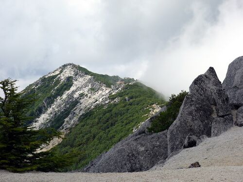 露岩帯に出ると、今回のハイライトである鳳凰三山の稜線歩きです。残念ながらガスがかかっており展望いまいちですが、それでも奇岩ばかりが続いており、非日常間たっぷりの景観でした。